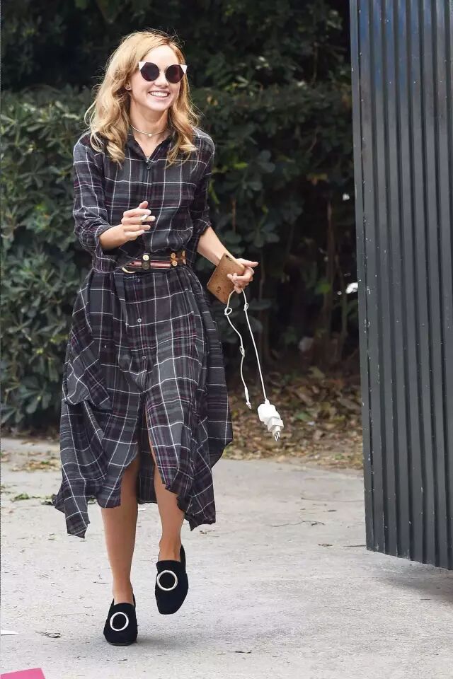 格子长款衬衫搭配一条皮带,外套也可以穿出裙子的感觉。