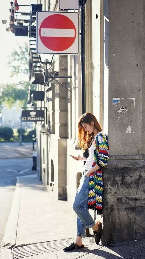 神仙姐姐的彩色条纹针织衫搭配白T、牛仔裤清纯无比。脚踩一双乐福鞋随性又时尚。