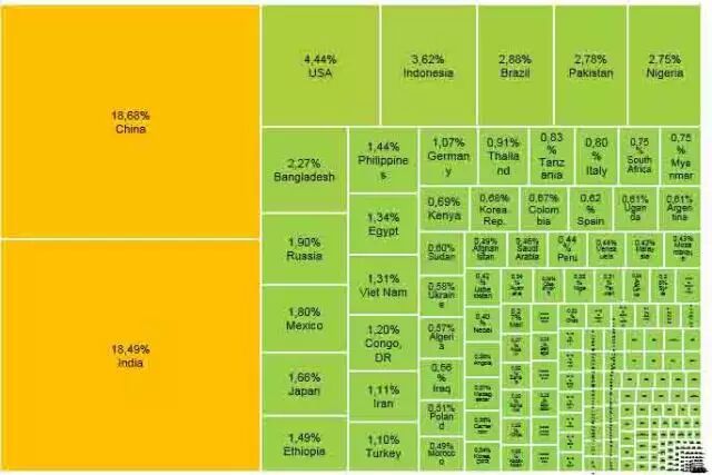 下图,你可以看到到2020年中国和印度人口都占到世界人口的18%以上。