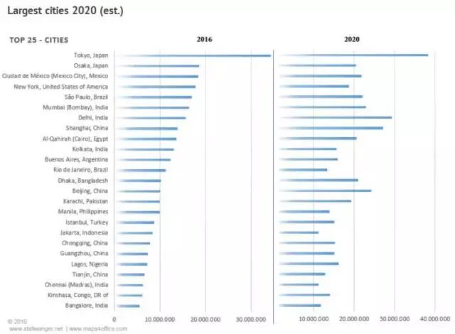 Maps4Office还对城市人口数量进行了排名,如下为2016年全球人口数量排名前25的城市,前两名都是日本的城市,分别为东京和大阪。中国的上海、北京、重庆、广州、天津分别排在第8、14、19、20、22位。