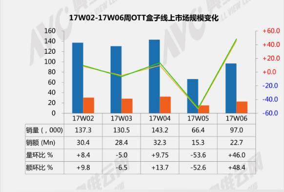 OTT盒子观察报告:奥维云网发布1月30日-2月5日OTT盒子观察报告,报告显示:2017年第06周,OTT盒子销量为9.7万台,环比上升46%;销额为0.23亿元,环比上升48.4%。本周均价是235元/台,环比上升1.6%;安卓盒子均价是281元/台,环比上升1.5%;阿里云OS盒子均价是202元/台,环比上升3%。