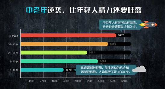 报告显示,18岁以下及28-36岁年龄段平均步数在5000步左右,步数较低,反而46岁以上的中老年平均步数在5400步以上,他们有较多的时间运动,对健康的重视也更强。