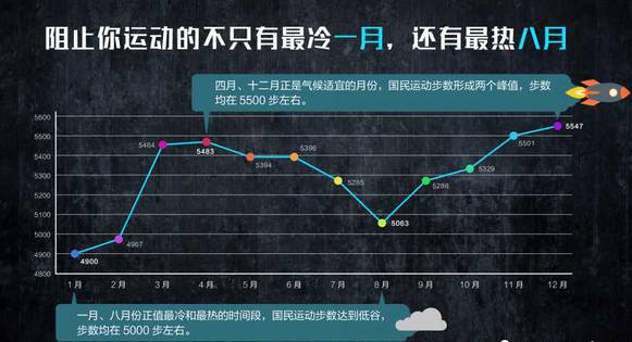 在时间方面,小编发现,一月和八月国民平均运动步数落到低谷,均在5000步左右,这两个时间正值最冷和最热的时间段;四月、十二月正是气候适宜的月份,国民运动步数形成两个峰值,步数均在5500步左右。