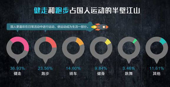 中国人最常进行的运动中,健走占比36.93%、跑步占比23.56%,两者之和超过60%;之后是骑车14.60%、健身9.84%、跳舞3.46%等,看来国人更喜欢在日常生活中可以随时进行的运动。