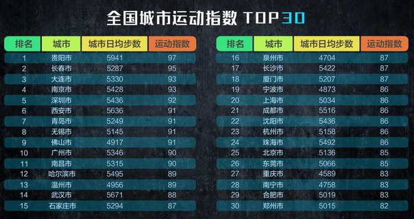 但《2016中国人运动报告》中可以看到,贵阳的城市运动指数为97、城市日均步数为5941步,两项数据均为全国最高!其次是长春、大连、南京和深圳,而在各大排行榜包揽“前三甲”的广州、上海和北京,却分别排在第10、20和25位。