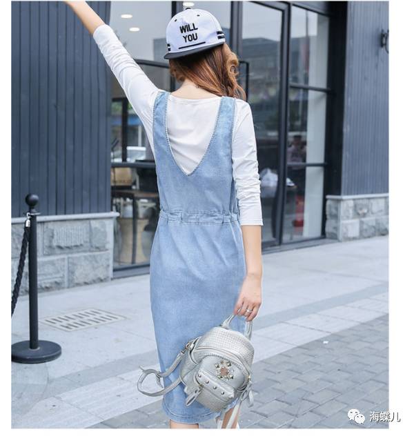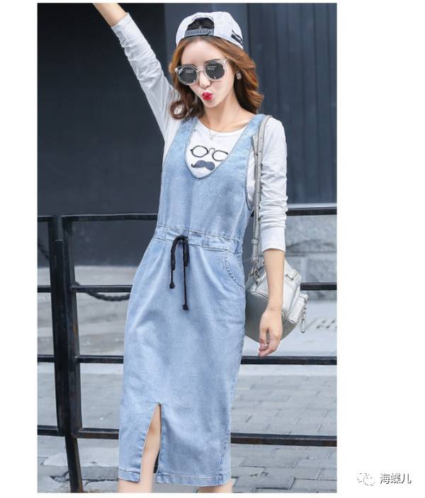 完美春装搭配示范分享NO3:休闲时尚牛仔中长款背带裙两件套连衣裙