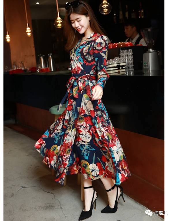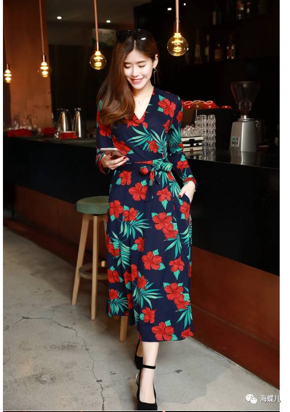 完美春装搭配示范分享NO1:花色中腰V领套头连衣裙