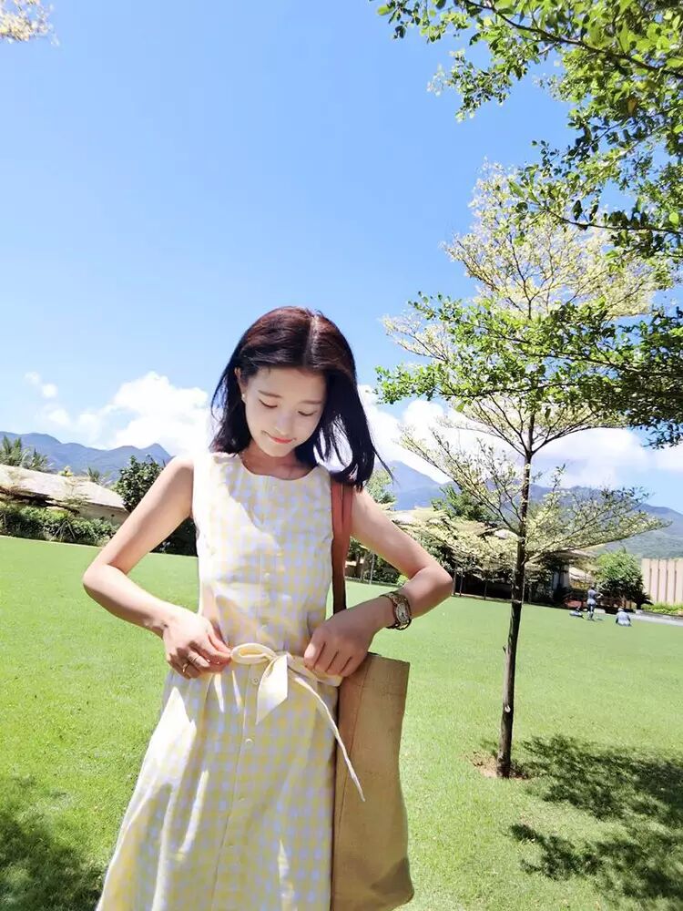 在这个炎热的夏天,这样一件黄格子连衣裙 穿上会格外的清爽 阳光。