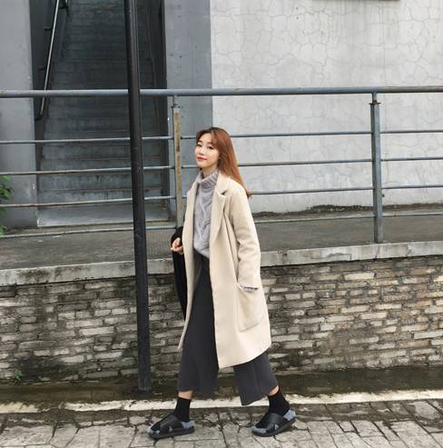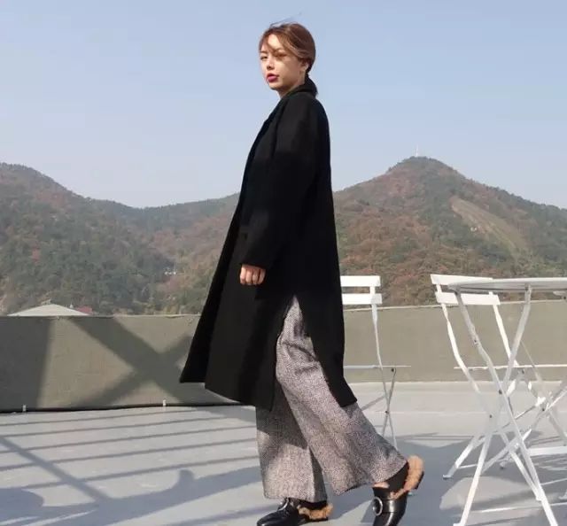 阔腿裤搭配长款大衣,更遮肉也更容易穿出时髦范儿~这款灰色阔腿裤搭配黑色长款开叉设计的毛呢大衣,配上今年流行的拖鞋款式毛毛鞋,超级拉风有木有~