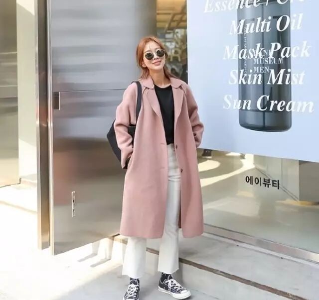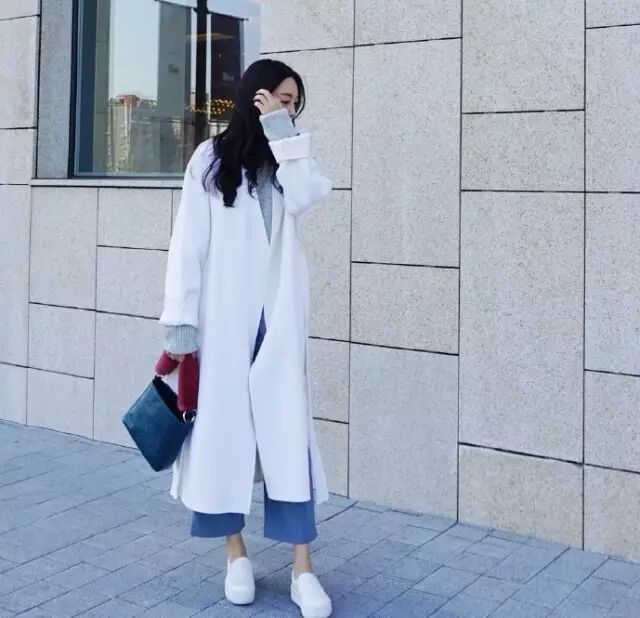 白色阔腿裤比较清新,搭配马卡龙色系的外套比较靓丽亮眼。这款白色阔腿裤搭配粉色长款毛呢大衣效果就比较好,帆布鞋减龄青春,再戴一款黑色墨镜,有酷又休闲~