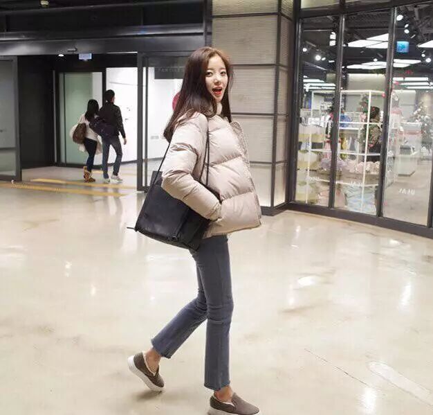 短款羽绒服适合搭配微喇形的阔腿裤,比较突出身材的曲线美,打造轻熟知性风。鞋子搭配上选择靴子比较端庄,运动鞋比较休闲减龄~这身灰色短款面包服搭配灰色微喇裤和懒人鞋,简单随性!