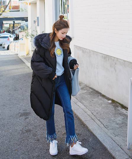 长款黑色羽绒服配深蓝色裤子、小白鞋的造型经常可以在街上见到,微阔的款式更能突出洒脱随性的气质!小白鞋的加入显得青春有活力!
