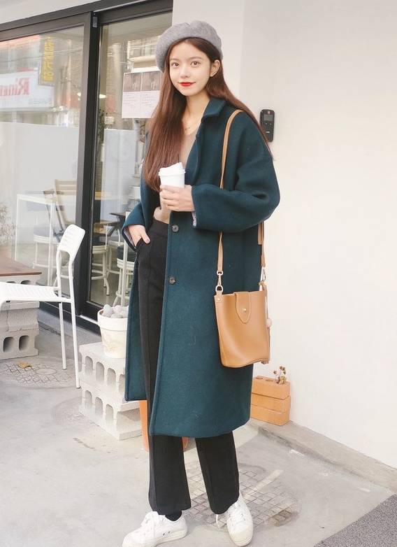 墨绿色搭配时选择黑色、棕色或者白色比较显气质!这款墨绿色大衣配色很和谐,搭配棕色复古小包、灰色贝雷帽,休闲文艺!