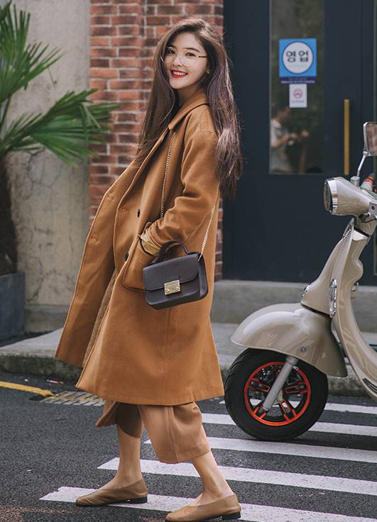 不怕冷的话,阔腿裤露出部分脚踝,搭配秀气的单鞋,能显瘦显脚小。这身衣服全是棕色,黑色小皮包点亮整个造型,整体复古洋气!