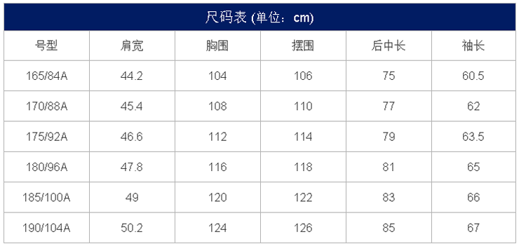 180码,肩宽46CM,胸围111CM,衣长81CM, 袖长66CM