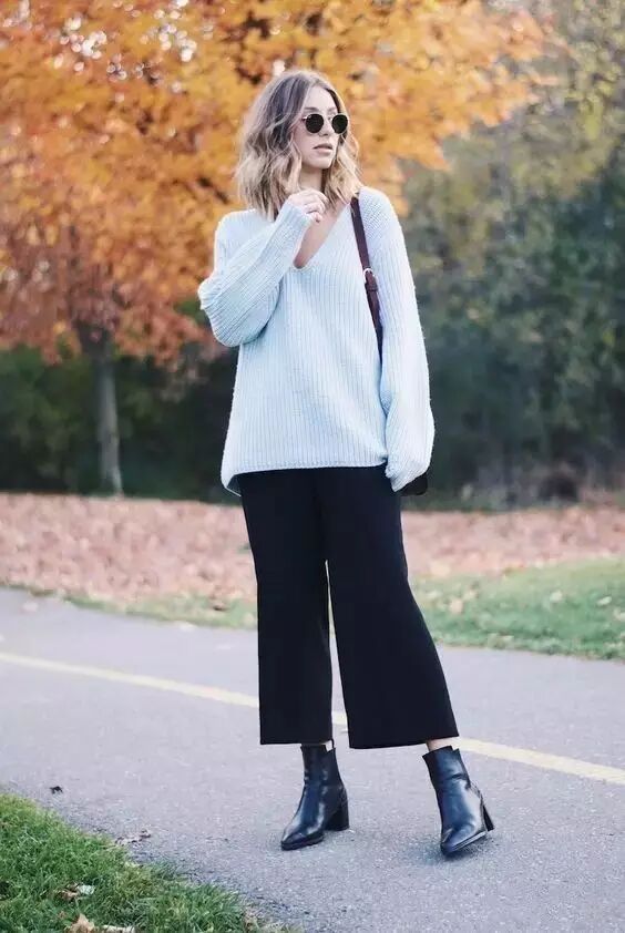 宽松毛衣+及地款阔腿裤+小白鞋,极简风的look很舒服养眼,高个子宝宝可以尝试