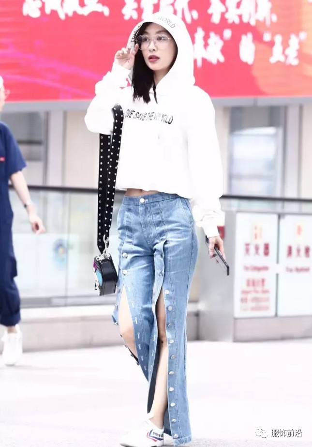 机场新icon李菲儿的Chrisou by Dan白色连帽超短卫衣+Chrisou by Dan开叉牛仔宽松阔腿裤,这个适合对自己腿型自信并有气场的时髦咖。