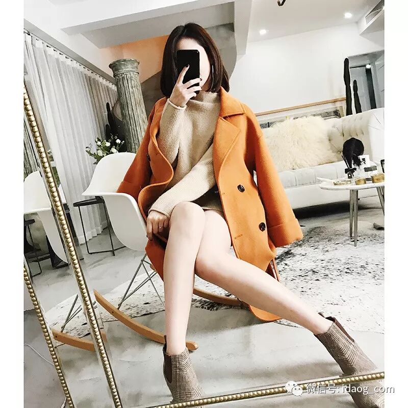 宽松中长款呢大衣,上身独显几分女王范,大大方方的翻领,帅气又不失时尚度。冬季内搭一款高领毛衣很暖和的呢,凸显出修长的脖颈,面料柔软很有垂坠感,适合各种身材的MM穿哦。