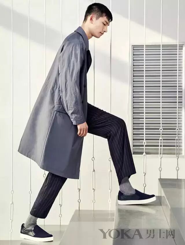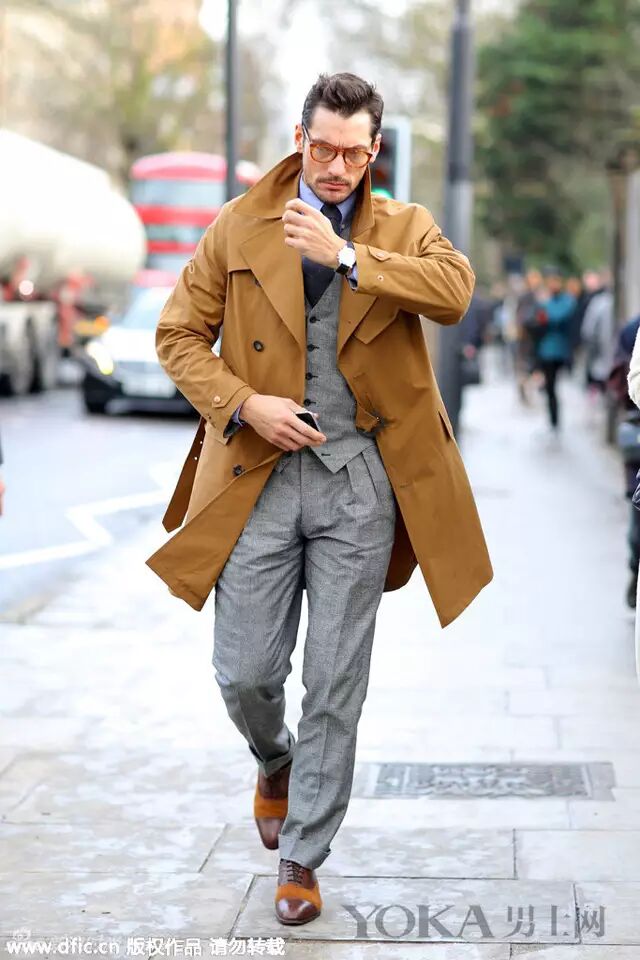 3.风衣长度根据你的身高来选择:175cm以下男士选购风衣建议长度在大腿中间处;175cm以上则建议在膝盖处。