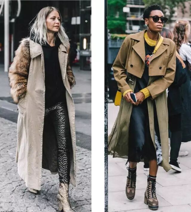 拼接面料让风衣更具个性,像皮草、薄纱等等,都可以跟风衣撞出不一样的时髦感。▼
