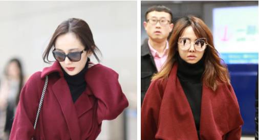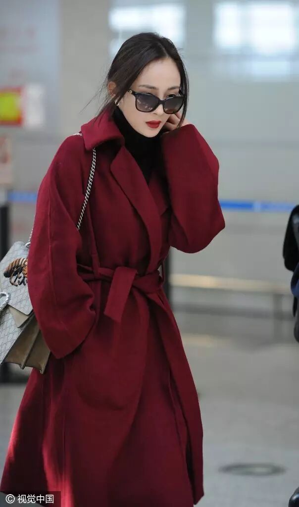 有木有觉得这件酒红色的大衣还挺眼熟的,前不久大幂幂的私服搭配中就出现过。