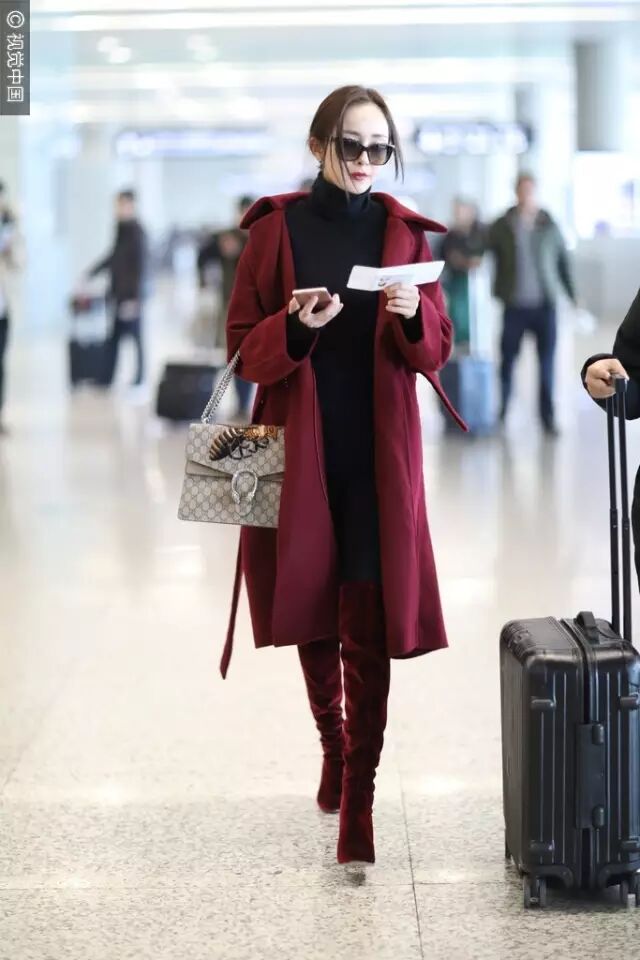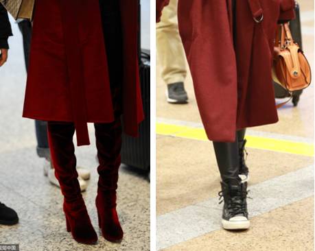 3、鞋子。下半身的对比就更明显了,幂幂同学不但穿了高跟,拉长腿部比例,还是选择了具有修饰腿部曲线的过膝靴,而且还是跟大衣同色的,再一次在视觉上延伸腿长。