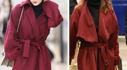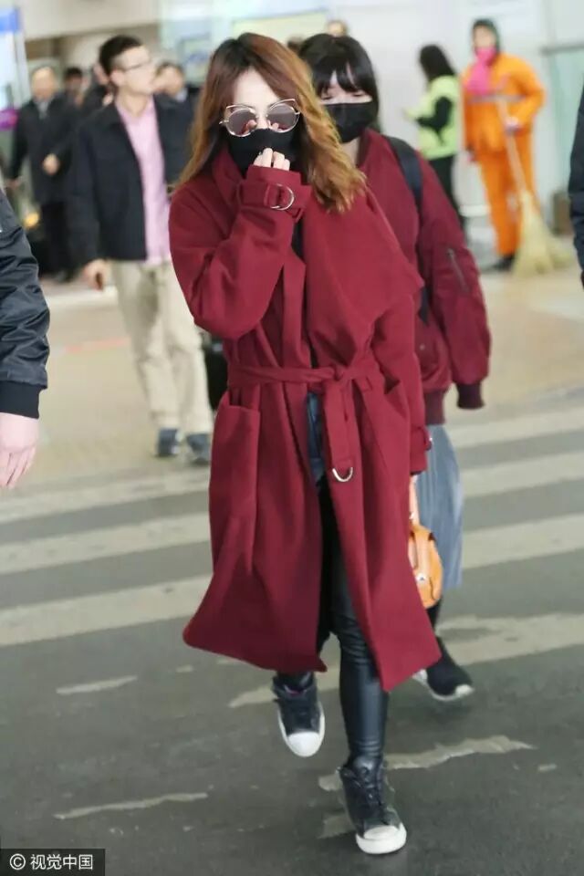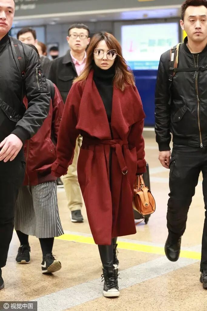 前几天,她穿了一件酒红色系带款呢子大衣现身北京机场,里面搭了黑色高领衫。本来身高就不到160,这件酒红色的长大衣穿在身材娇小的蔡依林身上,像小女孩偷穿了妈妈的衣服出门,总觉得怪怪的。