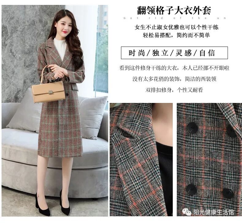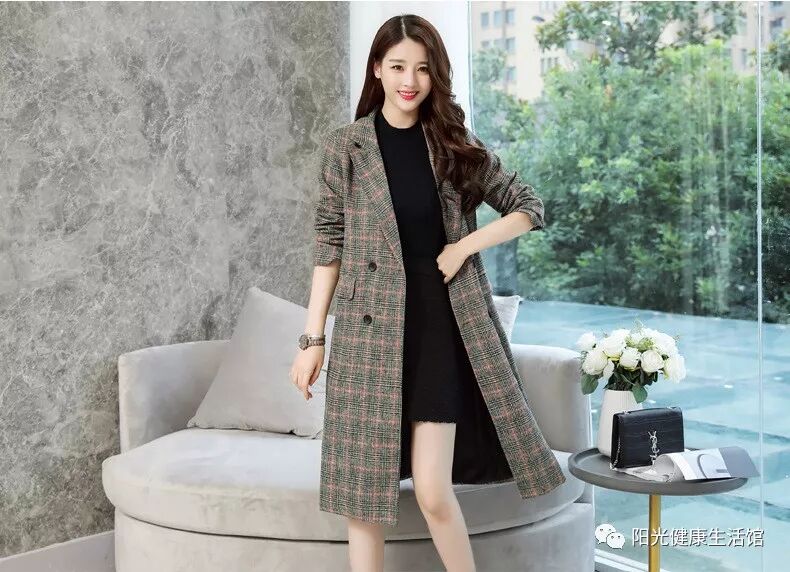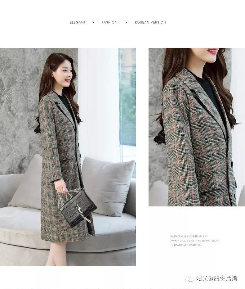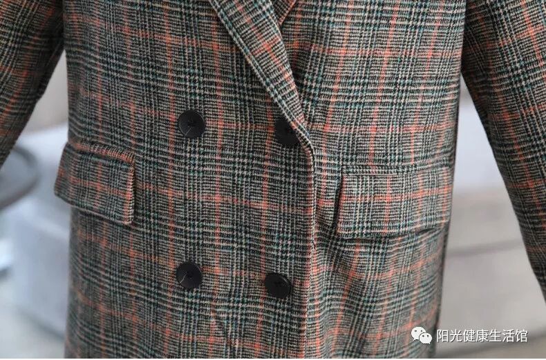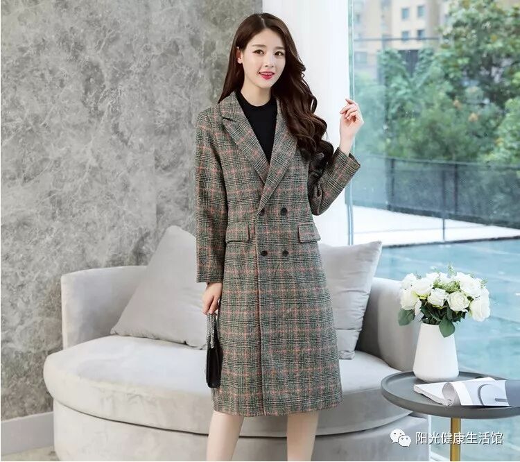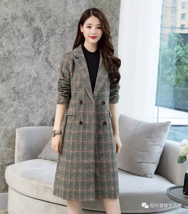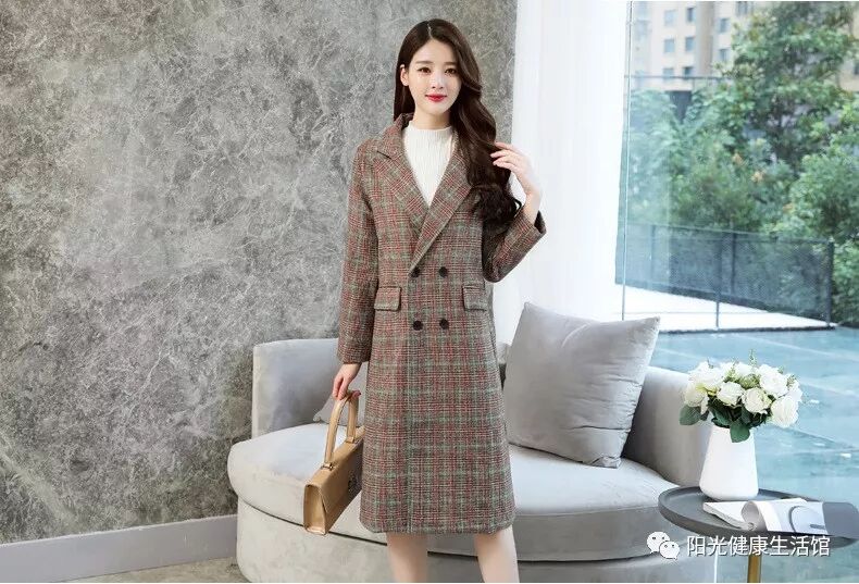 毛呢外套女中长款西装领双排扣呢大衣宽松格子毛呢大衣