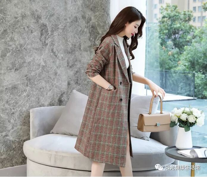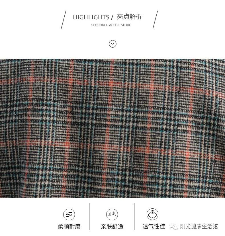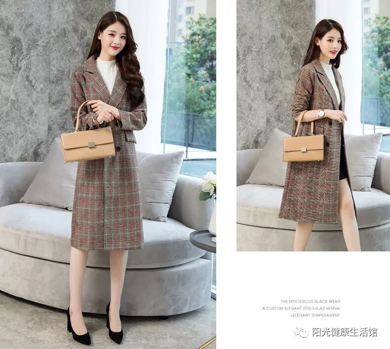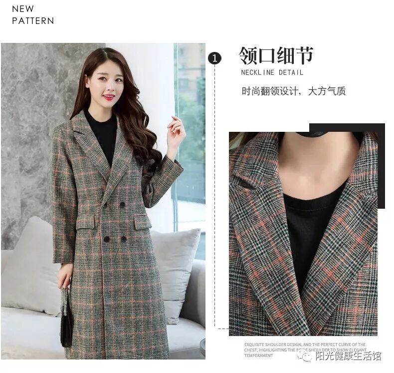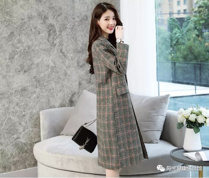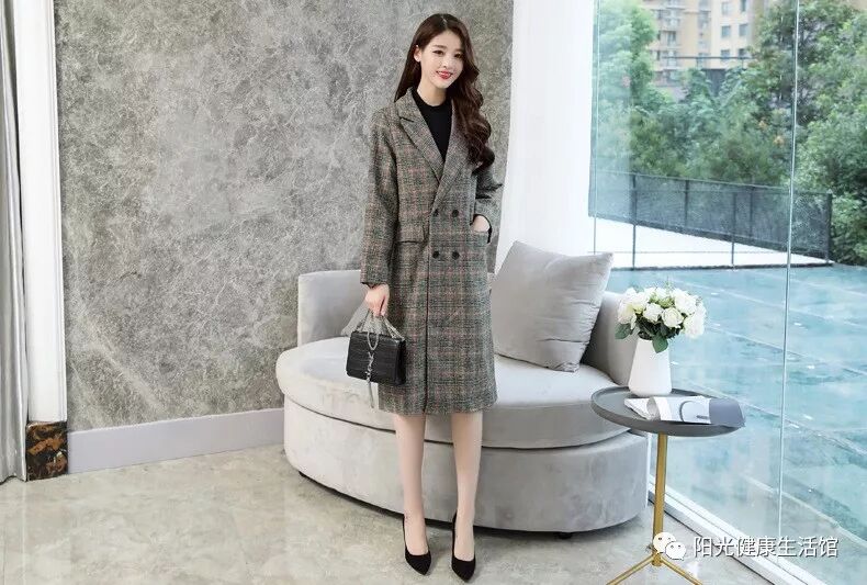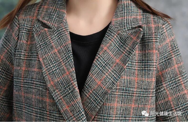 毛呢外套女中长款西装领双排扣呢大衣宽松格子毛呢大衣