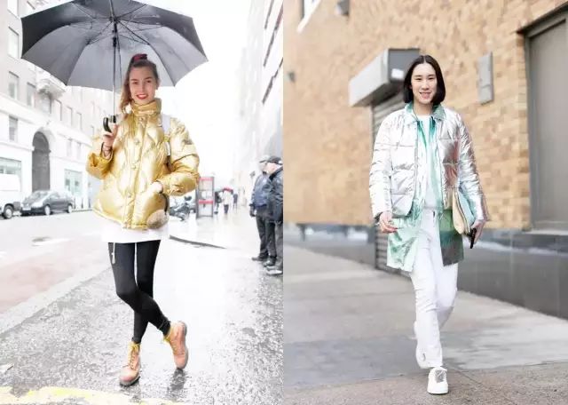 银色的和金色的短款羽绒服,非常的抢眼。利用内搭制造层次,更加的显高哦!