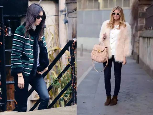 如果皮草色彩比较鲜艳,裤子最好选择深色,搭个墨镜,这气场杠杠的。