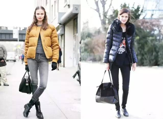 短款羽绒服搭配一条紧身的裤子,其实拉长全身的比例。