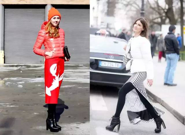 羽绒服内搭相同色系的的包臀长裙,变得更加有女人味。