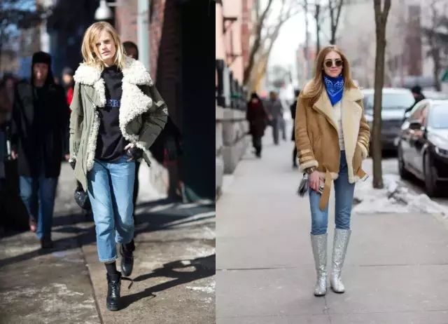 羊羔绒和蓝色牛仔裤非常的合拍,感觉暖暖的。