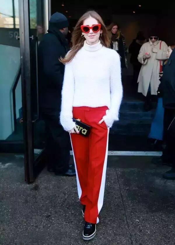 时尚博主chiara ferragni半高领毛衣+红色运动裤可是枪夺了不少人的目光呢▼