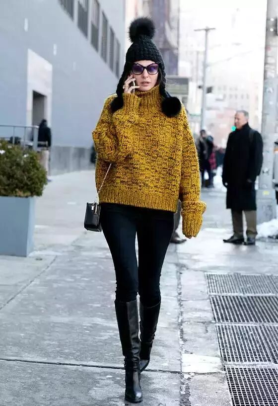 姜黄色的粗线高领衫配上黑色长裤长靴,帅气逼人▼