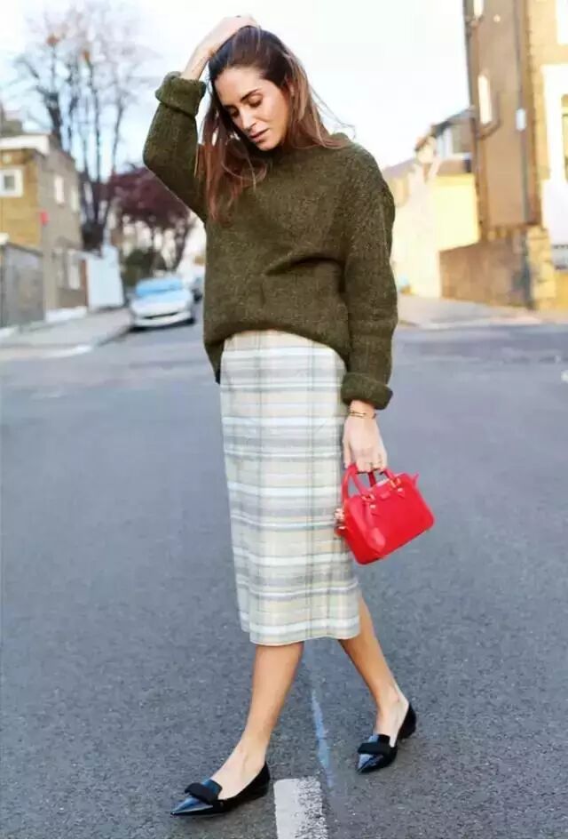 复古军绿毛衣+格子及膝裙▼