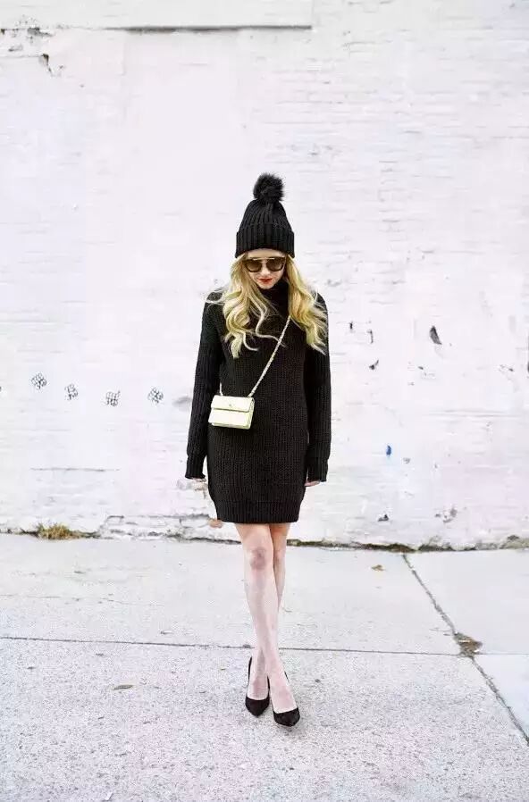 完全黑色的精致外观,皮草绒球的针织帽、长袖的针织裙与黑色尖头平底鞋▼