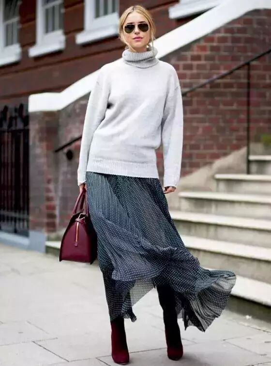 百褶裙或印花裙搭配高领毛衣,裙子明丽的色彩与飘逸的质感打破了高领毛衣古板的印象,立即使你的形象活力四射起来▼